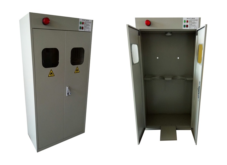 产品特点: 1.柜体:采用1.2mm厚宝钢优质冷轧钢板,经酸洗磷化处理,表面通过环氧树脂静电喷涂,达到防酸碱及防锈之效果。 2.门板:采用可脱卸铰链,正面带视窗,视窗为防爆玻璃。 3.PASS孔:柜体侧面设有PASS孔,保证柜内气体流动。 4.固定链条:内部采用固定式链条,防止气瓶倾倒。 5.踏板:柜体底部设有可调节踏板,方便气瓶装卸。 6.拉手:采用嵌入式高强度拉手。 7.报警器:可选择选用专用报警装置。报警装置可识别:可燃式气体如甲烷、乙炔、煤气等。 8.声光报警系统:当柜内传感器检测到气体泄漏时,会自动触发红灯闪烁和报警轰鸣声,同时自动排风。 9.自动排风系统:当柜内传感器检测到气体泄漏并报警的同时,顶部风机会自动工作,将气体通过排风管排出室外,保证工作区域的人身安全。