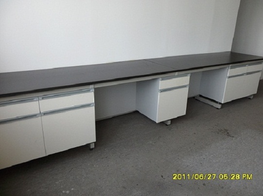主体钢架1.5厚。经环氧树脂静电喷涂,台面国产实心理化板,拉手为PVC一字型镶嵌式拉手或U型拉手,柜体采用18mm厚刨花板、门板采用17mm厚环保中纤板,其他材质价格另议。C型架按平均每1.2米一个布置。合页为DTC品牌,轨道为DTC品牌。